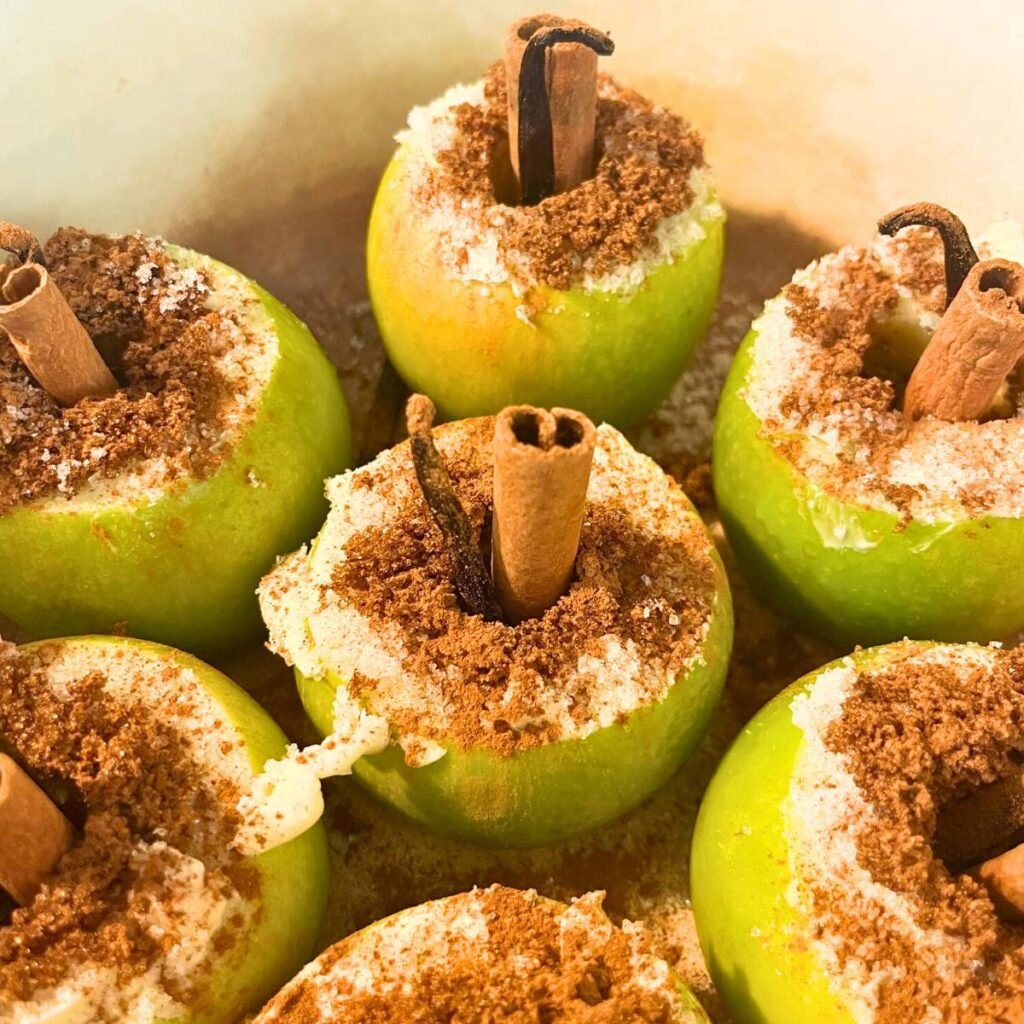 These baked cinnamon apples are easy to make, and oh how I love the aroma wafting through the kitchen. The juicy apples are stuffed with dark brown sugar, a cinnamon stick, and a vanilla bean, and topped with lemon sugar and a sprinkle of cinnamon making them a delicious and fun dessert to eat during the fall season.